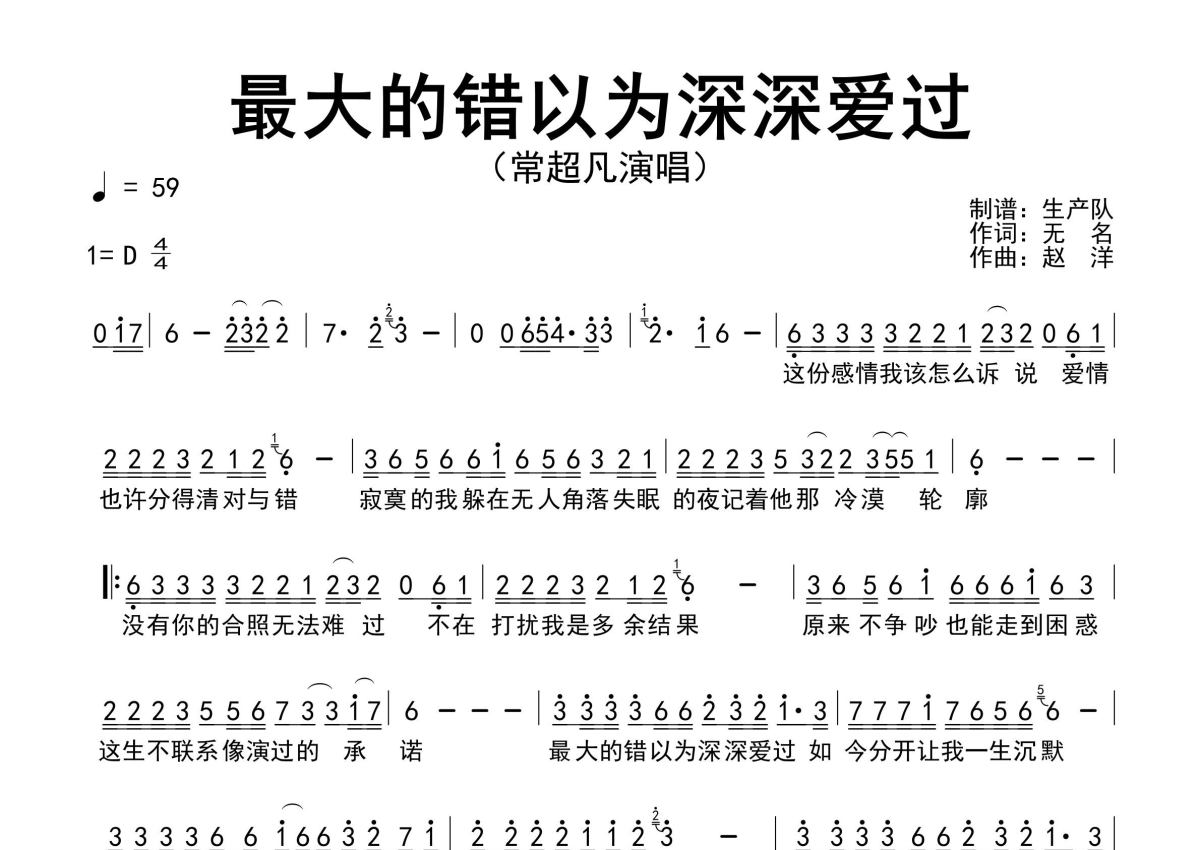 《最大的错以为深深爱过》是常超凡演唱的一首歌曲,原版简谱,拍号为4/4拍,歌曲速度为每分钟59拍,这份简谱共有一张高清图谱,图谱由 @生产队 编配上传常超凡演唱的歌曲《最大的错以为深深爱过》原版简谱,完整的前奏、间奏、尾奏solop编配。