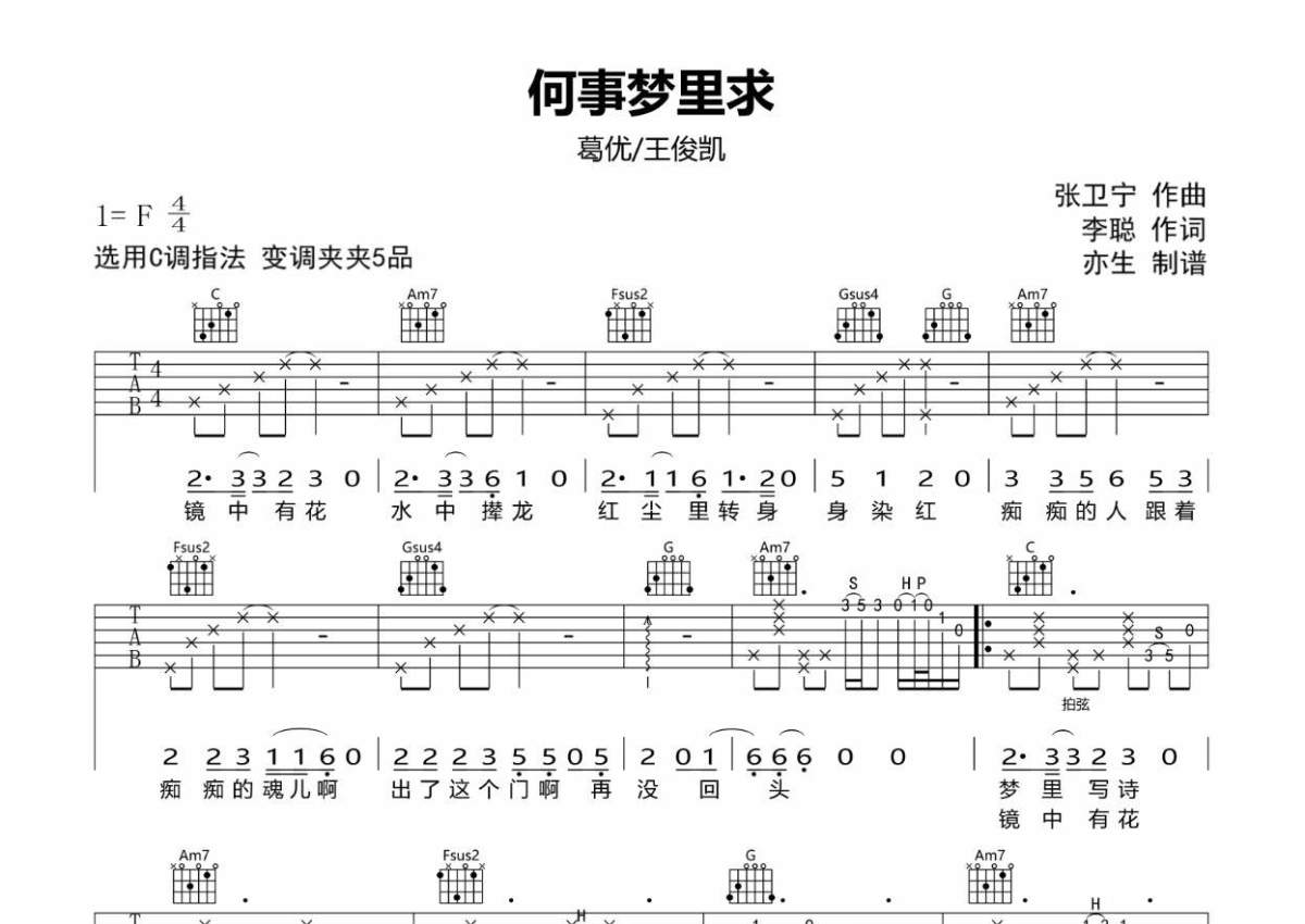 葛优/王俊凯《何事梦里求》吉他谱 - C调弹唱六线谱