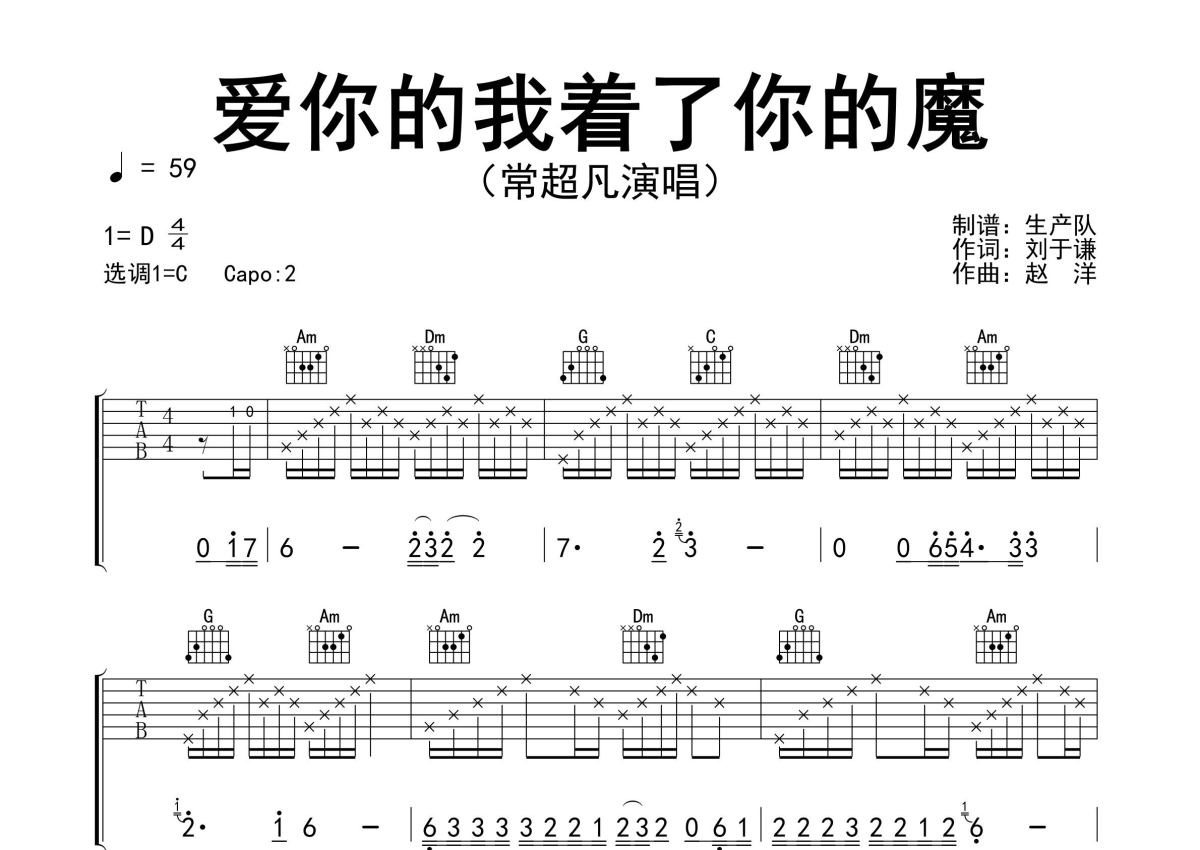 《爱你的我着了你的魔》是常超凡演唱的一首歌曲,精编完美版,拍号为4/4拍,歌曲速度为每分钟59拍,歌曲原调为D调,但由于原调指法比较难,为了方便弹奏,本吉他谱采用的是C调指法编配,变调夹2品弹奏即为原调,当然也可以根据自己的音域改变变调夹位置,或者通过改变和弦调性,以方便自己弹奏,这份吉他谱共有三张高清图谱,图谱由 @生产队 编配上传,图谱使用六线谱编配,包含吉他和弦指法、简谱以及歌词部分,使用这份爱你的我着了你的魔吉他谱,可以让你更加方便地掌握这首歌曲的弹唱技巧,快来尝试吧。《爱你的我着了你的魔》是常超凡演唱的歌曲。本吉他谱根据原版G调指法编配,完整的前奏、间奏、尾奏solo编配,精编完美版,值得推荐的一首伤感情歌。爱你的我却着了你的魔,我为你变得失魂落魄,你给我的难过比爱要多,让我怎么说爱你很快乐。