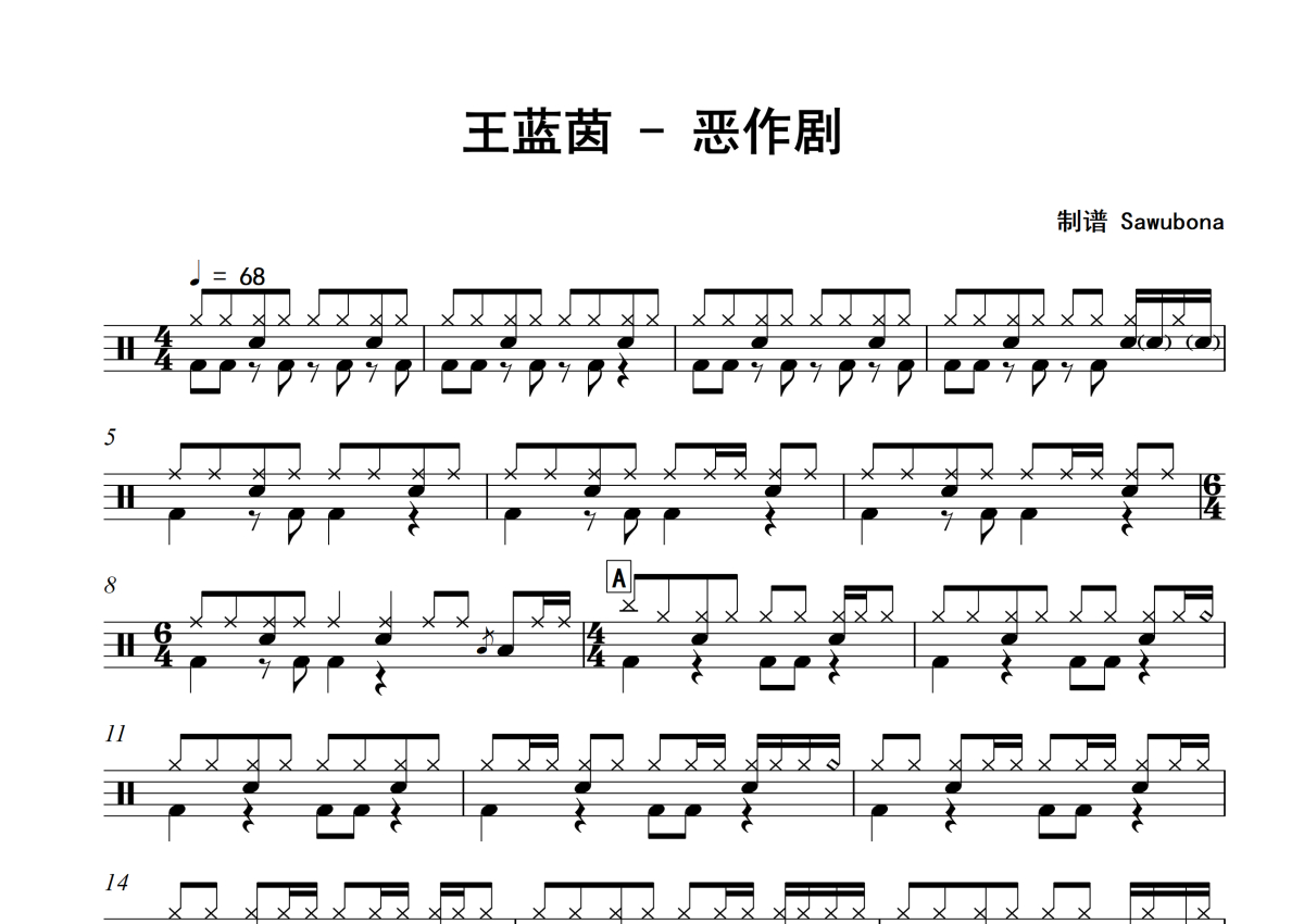 《恶作剧》是王蓝茵演唱的一首歌曲,拍号为4/4拍,歌曲速度为每分钟68拍,这份架子鼓谱共有两张高清图谱,图谱由 @Sawubona 编配上传,图谱使用五线谱编配,使用这份恶作剧架子鼓谱,你将能够轻松地敲打出这首王蓝茵的恶作剧,快来尝试吧。