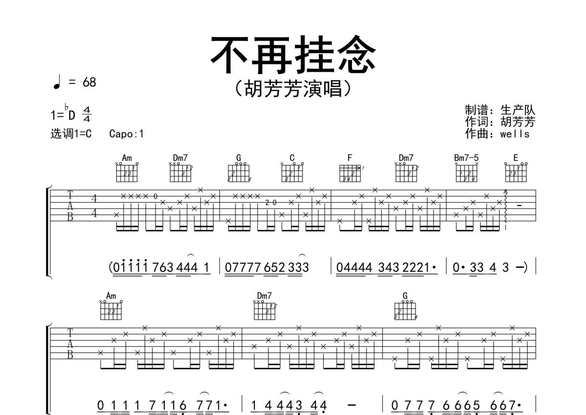 《不再挂念》是胡芳芳演唱的一首歌曲,精编完美版,拍号为4/4拍,歌曲速度为每分钟68拍,歌曲原调为Db调,但由于原调指法比较难,为了方便弹奏,本吉他谱采用的是C调指法编配,变调夹1品弹奏即为原调,当然也可以根据自己的音域改变变调夹位置,或者通过改变和弦调性,以方便自己弹奏,这份吉他谱共有三张高清图谱,图谱由 @生产队 编配上传,图谱使用六线谱编配,包含吉他和弦指法、简谱以及歌词部分,使用这份不再挂念吉他谱,可以让你更加方便地掌握这首歌曲的弹唱技巧,快来尝试吧。《不再挂念》是胡芳芳演唱的粤语歌曲。本吉他谱根据C调指法编配,完整的前奏、间奏、尾奏solo编配,精编完美版,一首动听的流行歌曲,值得推荐。始终有天不再挂念,谁只想牵你手不再有疑虑。