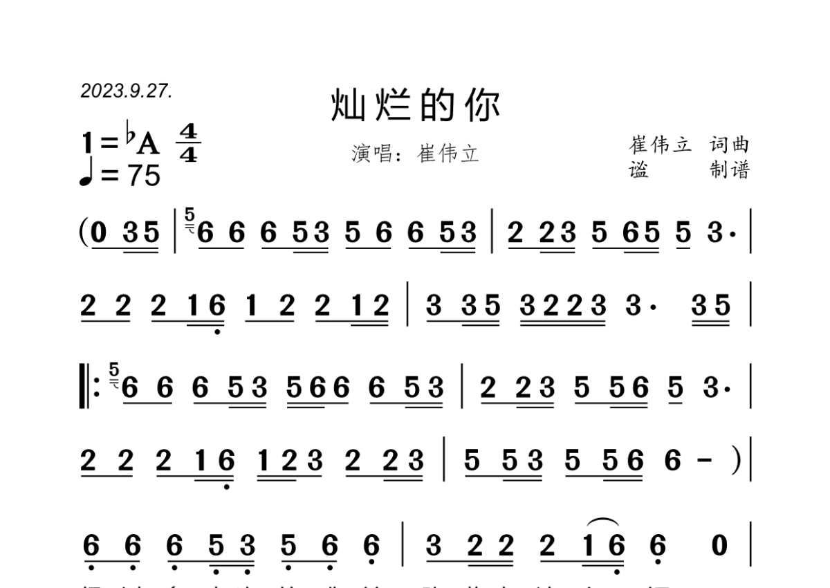 《灿烂的你》是崔伟立演唱的一首歌曲,拍号为4/4拍,歌曲速度为每分钟75拍,这份简谱共有两张高清图谱,图谱由 @谧 编配上传崔伟立作词作曲并演唱的《灿烂的你》,2023.9.27.发行,bA调,4/4拍,速度75,完整简谱,大字版,谧精心制谱,共2页。