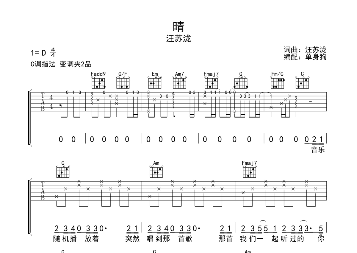 晴吉他谱 - 汪苏泷 - C调弹唱六线谱