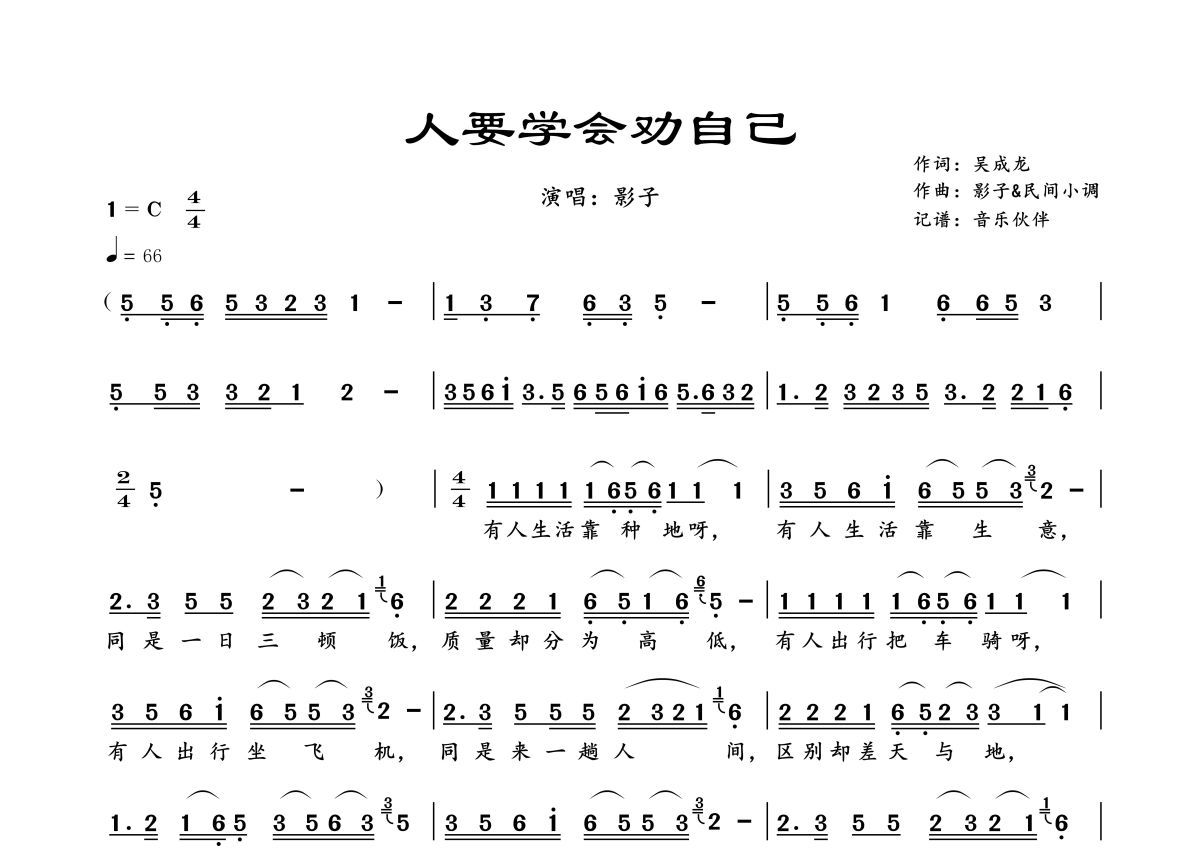 《人要学会劝自己》是影子演唱的一首歌曲,拍号为4/4拍,歌曲速度为每分钟66拍,这份简谱共有一张高清图谱,图谱由 @音乐伙伴 编配上传。