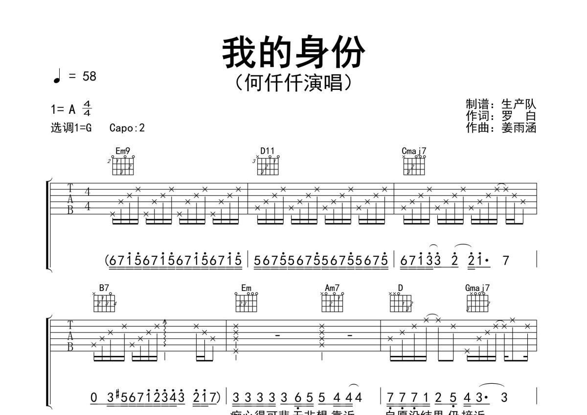 《我的身份》是何仟仟演唱的一首歌曲,精编完美版,拍号为4/4拍,歌曲速度为每分钟58拍,歌曲原调为A调,但由于原调指法比较难,为了方便弹奏,本吉他谱采用的是G调指法编配,变调夹2品弹奏即为原调,当然也可以根据自己的音域改变变调夹位置,或者通过改变和弦调性,以方便自己弹奏,这份吉他谱共有三张高清图谱,图谱由 @生产队 编配上传,图谱使用六线谱编配,包含吉他和弦指法、简谱以及歌词部分,使用这份我的身份吉他谱,可以让你更加方便地掌握这首歌曲的弹唱技巧,快来尝试吧。《我的身份》是何仟仟演唱的歌曲。本吉他谱根据原版G调指法编配,完整的前奏、间奏、尾奏solo编配,精编完美版,一首动听的粤语歌曲,值得推荐。宁愿爱平分,成全我的身份,用我的余生, 抚慰你的心瘾。