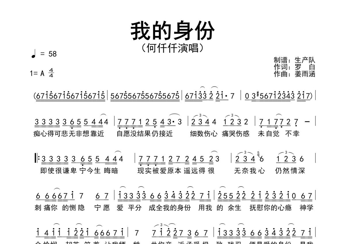 《我的身份》是何仟仟演唱的一首歌曲,原版简谱,拍号为4/4拍,歌曲速度为每分钟58拍,这份简谱共有一张高清图谱,图谱由 @生产队 编配上传何仟仟演唱的粤语歌曲《我的身份》原版简谱,完整的前奏、间奏、尾奏solo编配。