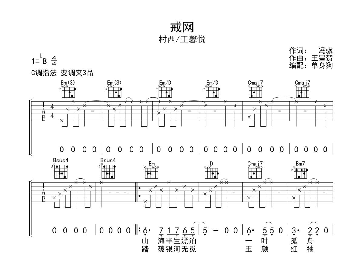 《戒网》是村西/王馨悦演唱的一首歌曲,拍号为4/4拍,歌曲原调为Bb调,但由于原调指法比较难,为了方便弹奏,本吉他谱采用的是G调指法编配,变调夹3品弹奏即为原调,当然也可以根据自己的音域改变变调夹位置,或者通过改变和弦调性,以方便自己弹奏,这份吉他谱共有三张高清图谱,图谱由 @单身狗 编配上传,图谱使用六线谱编配,包含吉他和弦指法、简谱以及歌词部分,使用这份戒网吉他谱,可以让你更加方便地掌握这首歌曲的弹唱技巧,快来尝试吧。