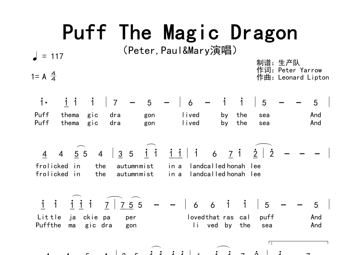 《Puff The Magic Dragon》是Peter, Paul & Mary演唱的一首歌曲,拍号为4/4拍,歌曲速度为每分钟117拍,这份简谱共有两张高清图谱,图谱由 @生产队 编配上传。