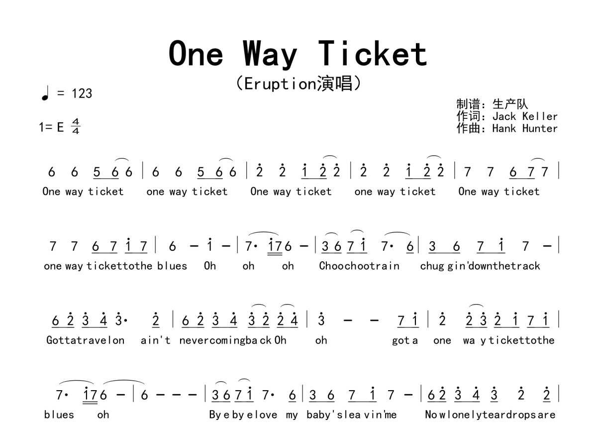 《One Way Ticket》是Eruption演唱的一首歌曲,拍号为4/4拍,歌曲速度为每分钟123拍,这份简谱共有一张高清图谱,图谱由 @生产队 编配上传。