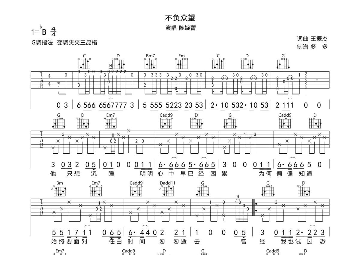 《不负众望》是陈婉菁演唱的一首歌曲,拍号为4/4拍,歌曲速度为每分钟75拍,歌曲原调为Bb调,但由于原调指法比较难,为了方便弹奏,本吉他谱采用的是G调指法编配,变调夹3品弹奏即为原调,当然也可以根据自己的音域改变变调夹位置,或者通过改变和弦调性,以方便自己弹奏,这份吉他谱共有两张高清图谱,图谱由 @圆创吉他谱 编配上传,图谱使用六线谱编配,包含吉他和弦指法、简谱以及歌词部分,使用这份不负众望吉他谱,可以让你更加方便地掌握这首歌曲的弹唱技巧,快来尝试吧。《不负众望》是陈婉菁演唱的一首歌曲,拍号为4/4拍,歌曲原调降B调,但由于原调指法比较难,为了方便弹奏,本吉 他谱采用的是G调指法编配,变调夹3品弹奏即为原调,当然也可以根据自己的音域改变变调夹位置,或者通过改变和弦调性,以方便自己弹哦。