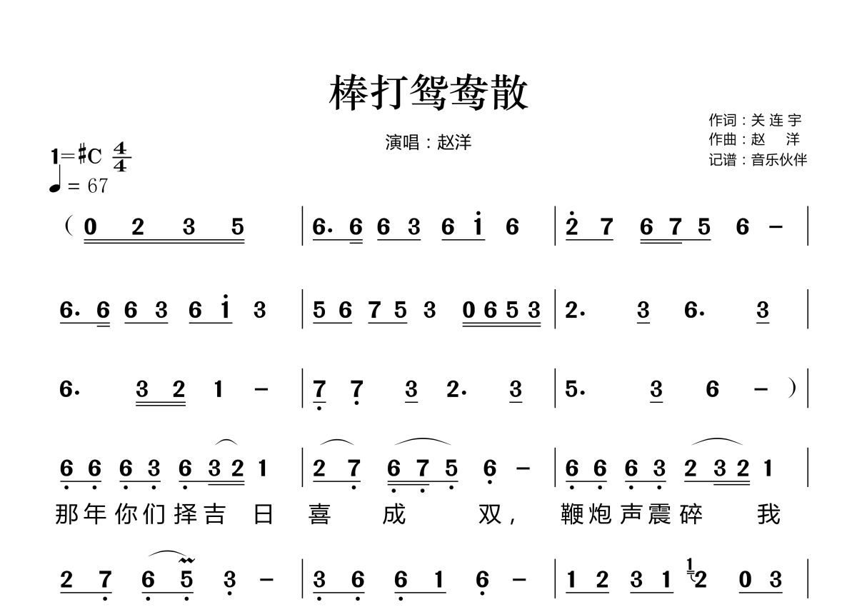 《棒打鸳鸯散》是赵洋演唱的一首歌曲,这份简谱共有两张高清图谱,图谱由 @音乐伙伴 编配上传。