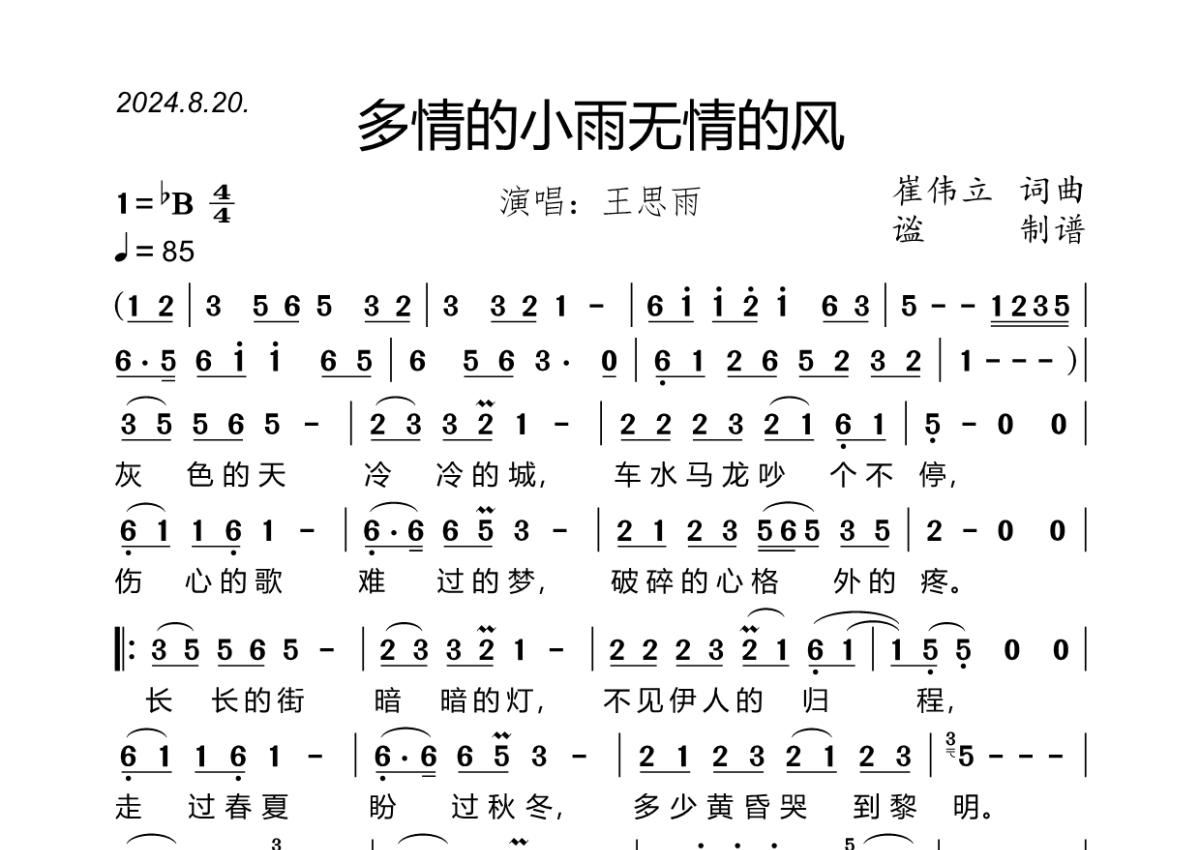 《多情的小雨无情的风》是王思雨演唱的一首歌曲,拍号为4/4拍,歌曲速度为每分钟85拍,这份简谱共有一张高清图谱,图谱由 @谧 编配上传王思雨演唱的《多情的小雨无情的风》,2024.8.20.发行,bB调,4/4拍,速度85,完整简谱,谧精心制谱,共1页。