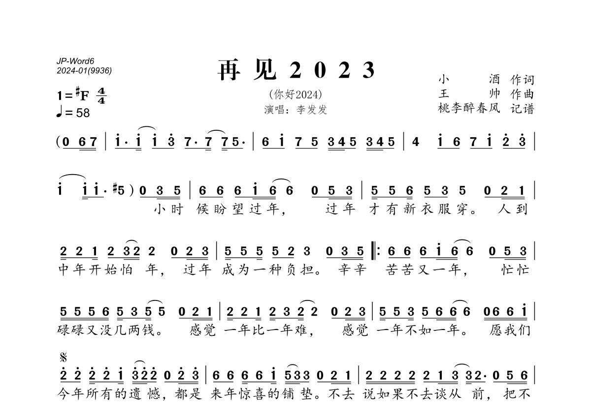 《再见2023》是李发发演唱的一首歌曲,拍号为4/4拍,歌曲速度为每分钟58拍,这份简谱共有一张高清图谱,图谱由 @桃李醉春风 编配上传。