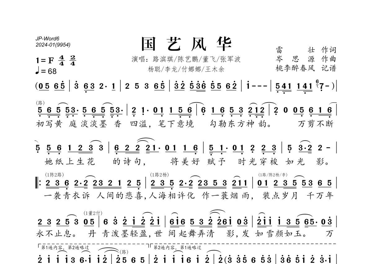 《国艺风华》是路滨琪/陈艺鹏/董飞/张军波杨聪/李龙/付娜娜/王木余演唱的一首歌曲,拍号为4/4拍,歌曲速度为每分钟68拍,这份简谱共有一张高清图谱,图谱由 @桃李醉春风 编配上传。
