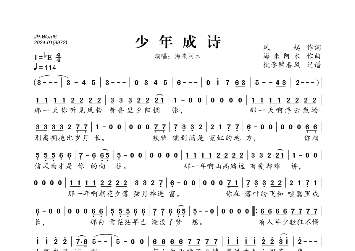《少年成诗》是海来阿木演唱的一首歌曲,歌曲速度为每分钟114拍,这份简谱共有一张高清图谱,图谱由 @桃李醉春风 编配上传。