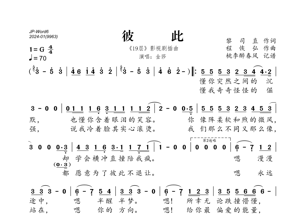 《彼此》是金莎演唱的一首歌曲,拍号为4/4拍,歌曲速度为每分钟70拍,这份简谱共有一张高清图谱,图谱由 @桃李醉春风 编配上传。