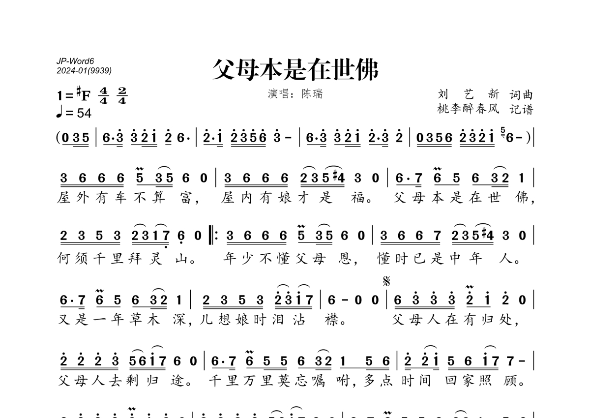 《父母本是在世佛》是陈瑞演唱的一首歌曲,拍号为4/4拍,歌曲速度为每分钟54拍,这份简谱共有一张高清图谱,图谱由 @桃李醉春风 编配上传。