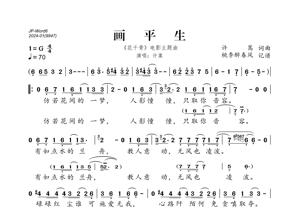 《画平生》是许嵩演唱的一首歌曲,拍号为4/4拍,歌曲速度为每分钟70拍,这份简谱共有一张高清图谱,图谱由 @桃李醉春风 编配上传。