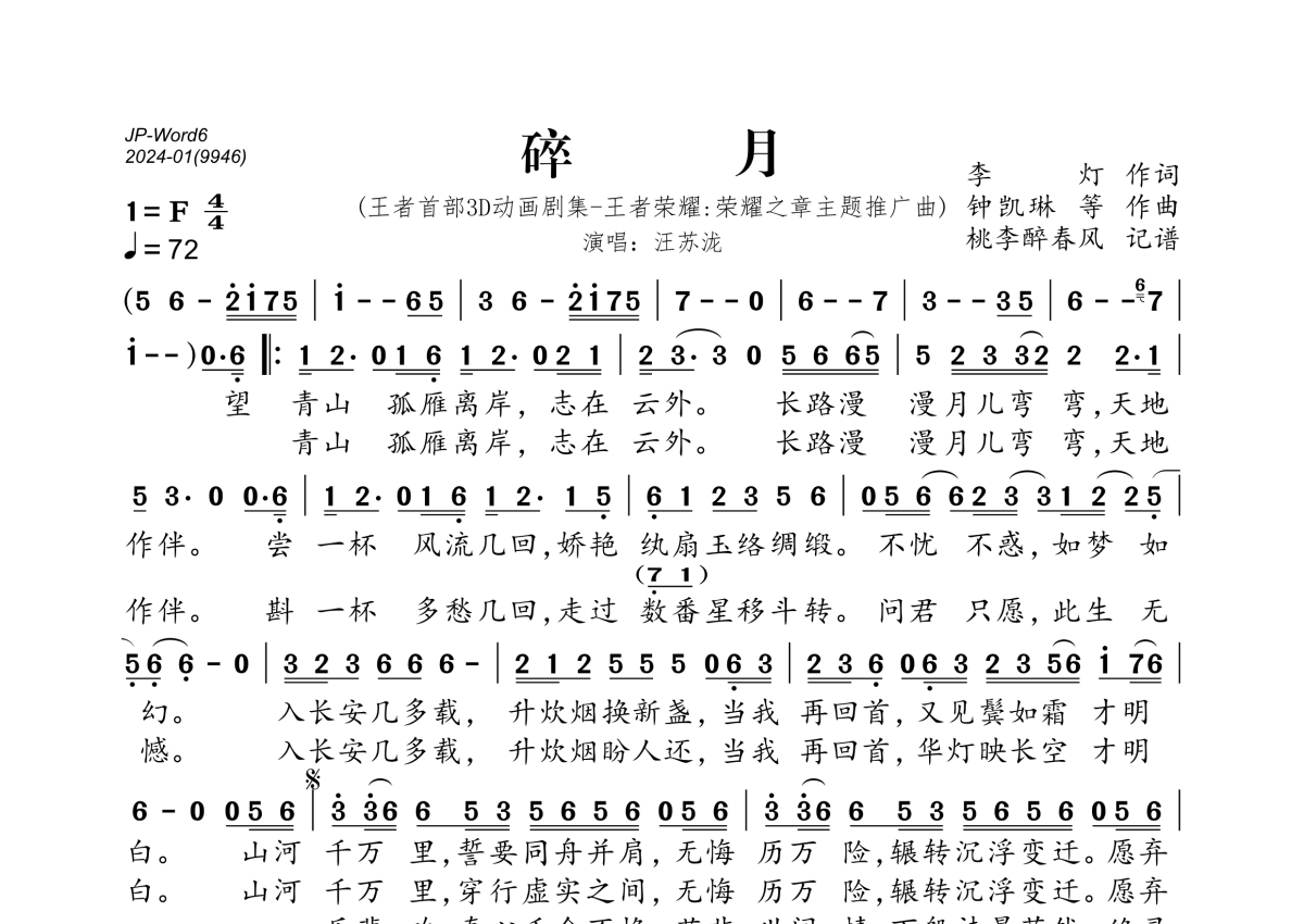 《碎月》是汪苏泷演唱的一首歌曲,拍号为4/4拍,歌曲速度为每分钟72拍,这份简谱共有一张高清图谱,图谱由 @桃李醉春风 编配上传。