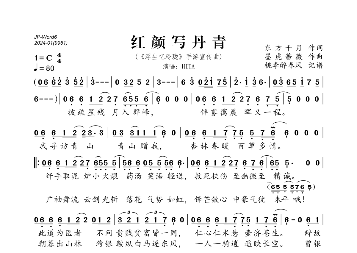 《红颜写丹青》是HITA演唱的一首歌曲,拍号为4/4拍,歌曲速度为每分钟80拍,这份简谱共有一张高清图谱,图谱由 @桃李醉春风 编配上传。