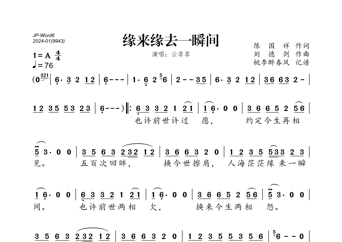 《缘来缘去一瞬间》是云菲菲演唱的一首歌曲,拍号为4/4拍,歌曲速度为每分钟76拍,这份简谱共有一张高清图谱,图谱由 @桃李醉春风 编配上传。