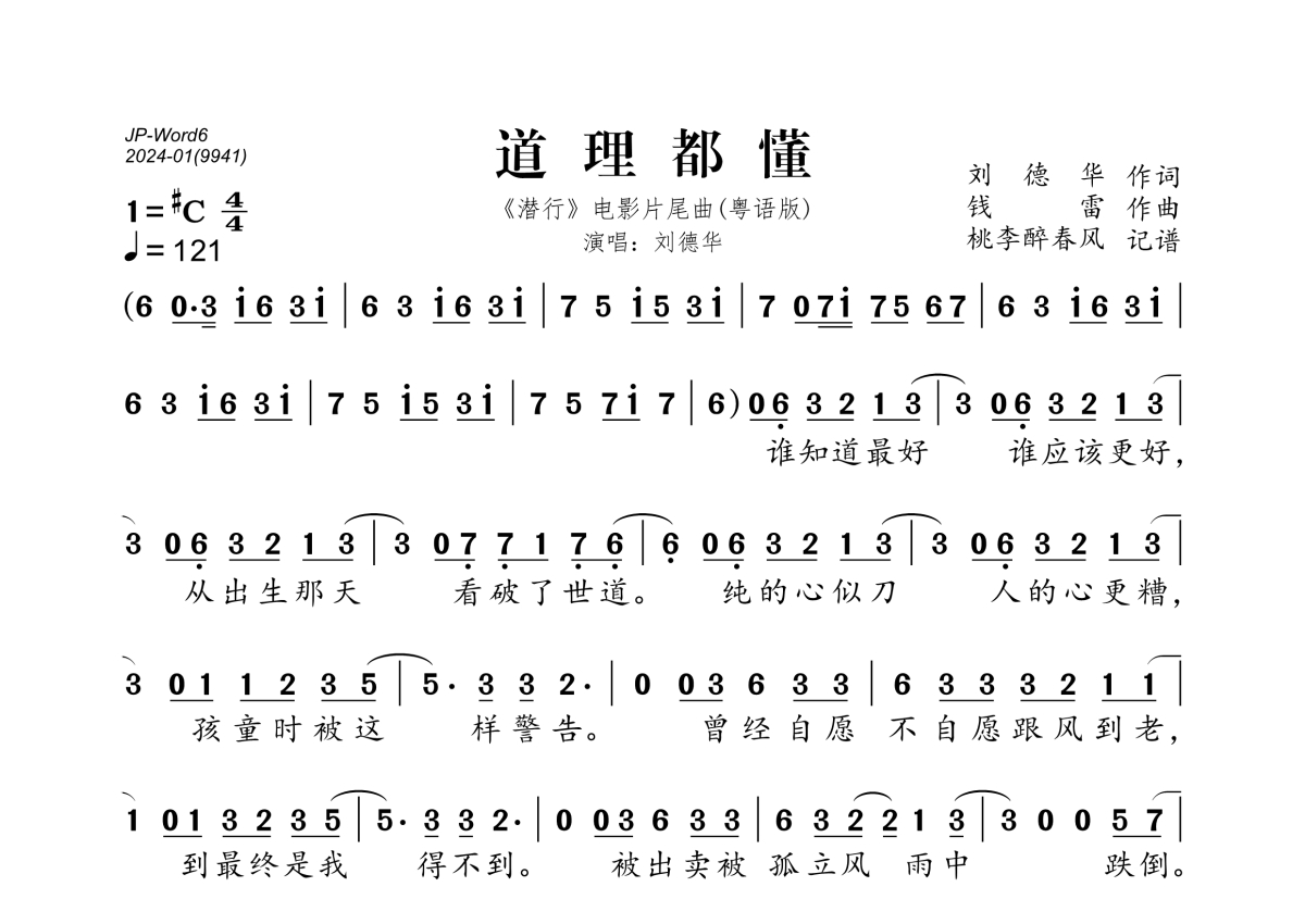 《道理都懂》是刘德华演唱的一首歌曲,拍号为4/4拍,歌曲速度为每分钟121拍,这份简谱共有两张高清图谱,图谱由 @桃李醉春风 编配上传。