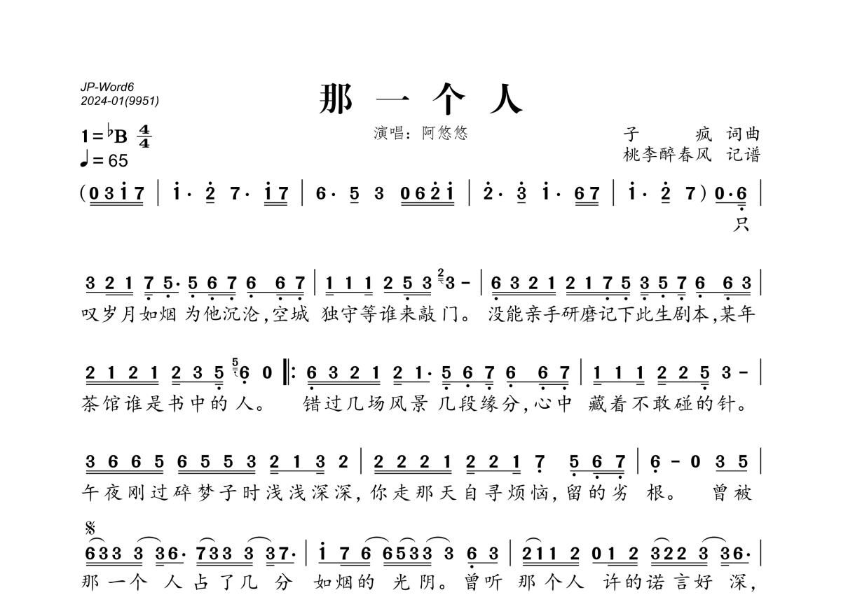 《那一个人》是阿悠悠演唱的一首歌曲,拍号为4/4拍,歌曲速度为每分钟65拍,这份简谱共有一张高清图谱,图谱由 @桃李醉春风 编配上传。