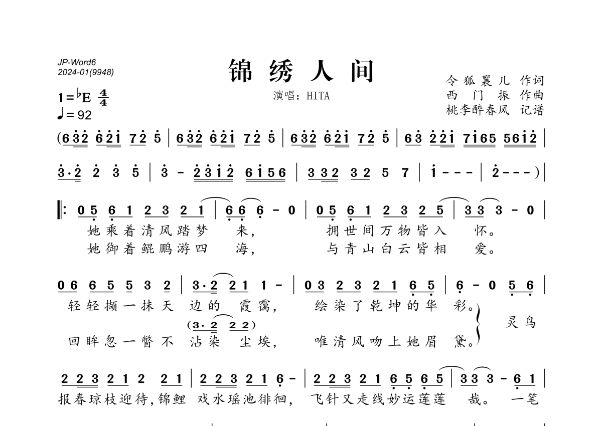 《锦绣人间》是HITA演唱的一首歌曲,拍号为4/4拍,歌曲速度为每分钟92拍,这份简谱共有一张高清图谱,图谱由 @桃李醉春风 编配上传。