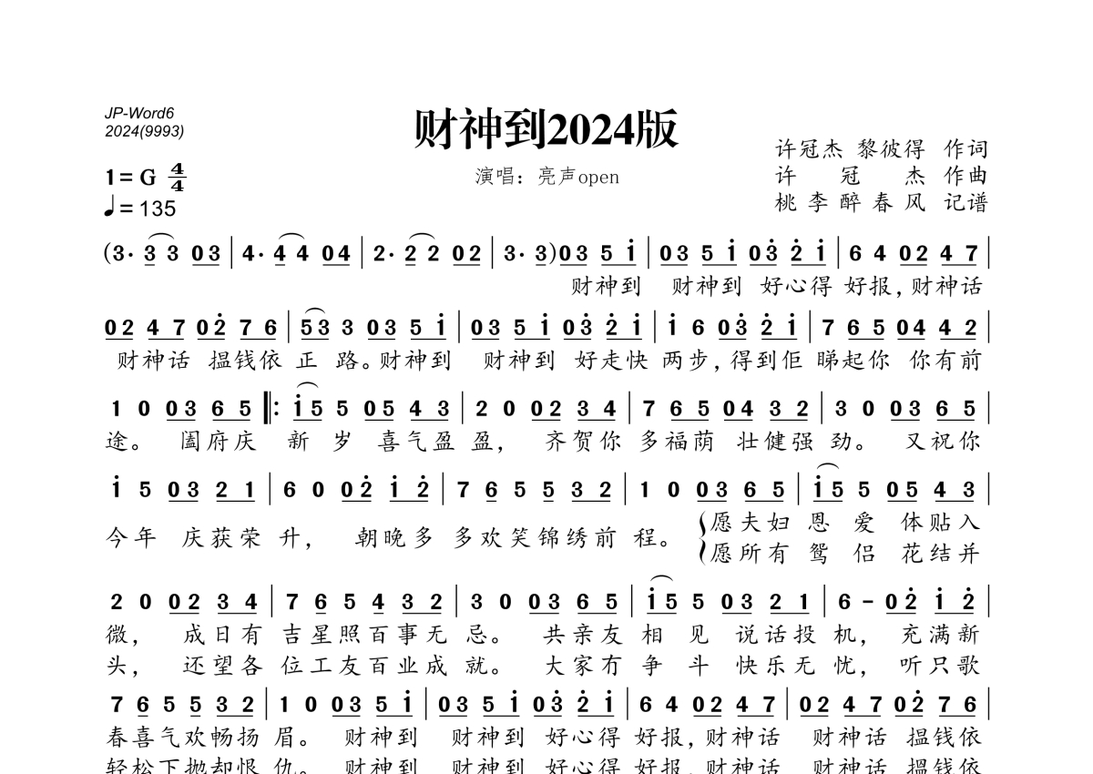 《财神到2024版》是亮声open演唱的一首歌曲,拍号为4/4拍,歌曲速度为每分钟135拍,这份简谱共有一张高清图谱,图谱由 @桃李醉春风 编配上传。