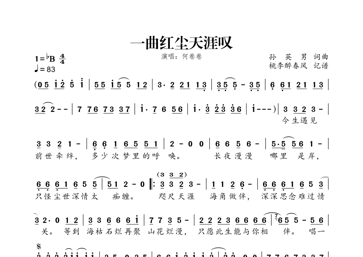 《一曲红尘天涯叹》是何卷卷演唱的一首歌曲,拍号为4/4拍,歌曲速度为每分钟83拍,这份简谱共有一张高清图谱,图谱由 @桃李醉春风 编配上传。
