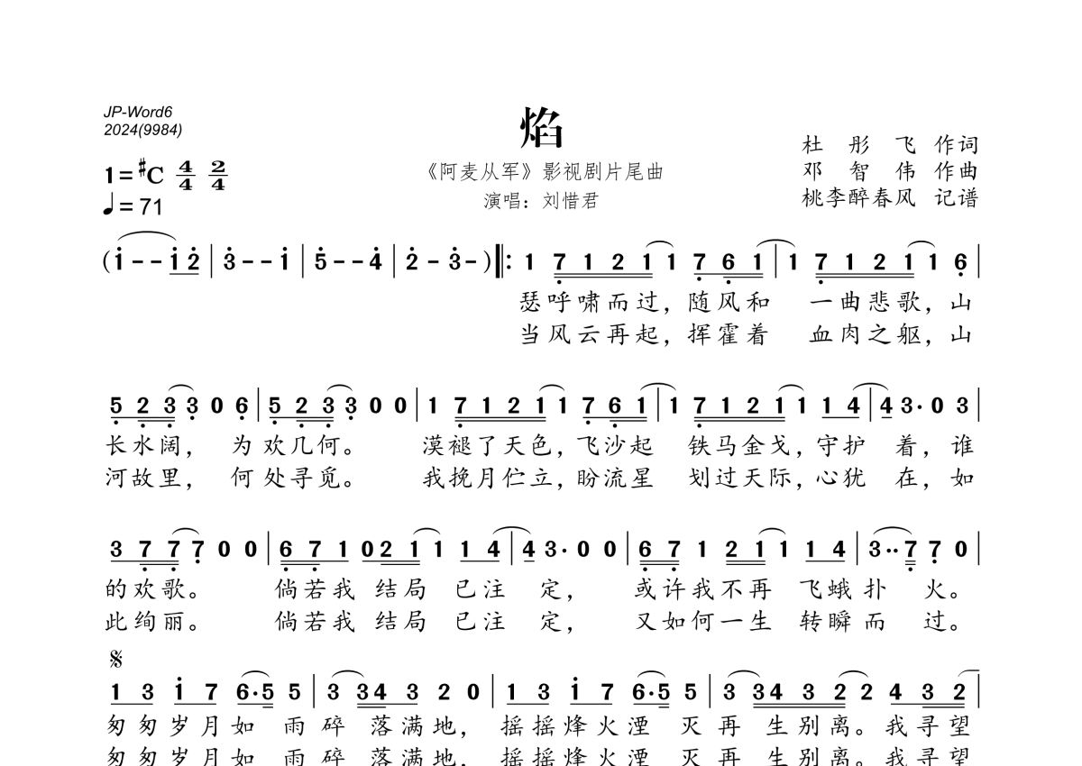 《焰》是刘惜君演唱的一首歌曲,拍号为4/4拍,歌曲速度为每分钟71拍,这份简谱共有一张高清图谱,图谱由 @桃李醉春风 编配上传。