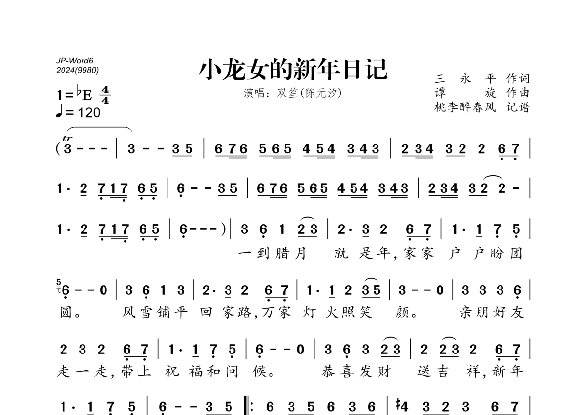 《小龙女的新年日记》是双笙演唱的一首歌曲,拍号为4/4拍,歌曲速度为每分钟120拍,这份简谱共有两张高清图谱,图谱由 @桃李醉春风 编配上传。