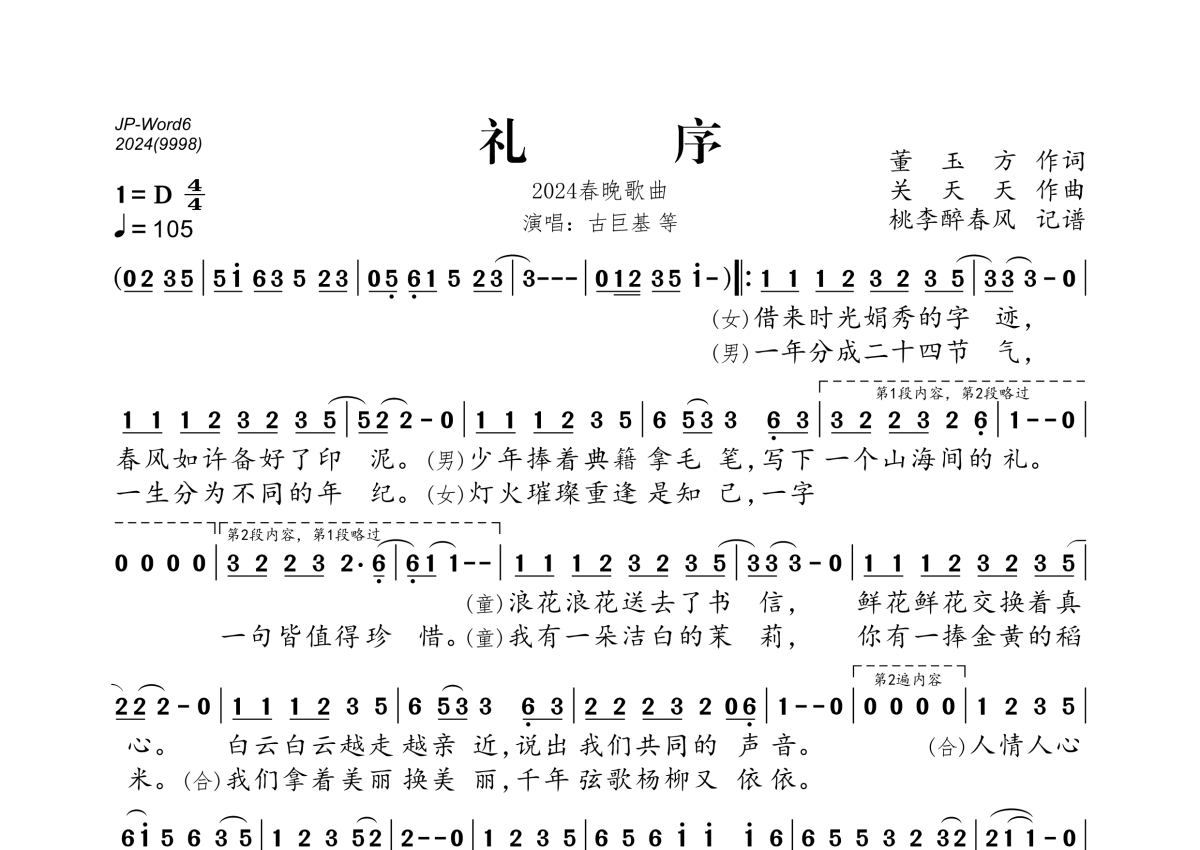 《礼序》是古巨基等演唱的一首歌曲,拍号为4/4拍,歌曲速度为每分钟105拍,这份简谱共有一张高清图谱,图谱由 @桃李醉春风 编配上传。