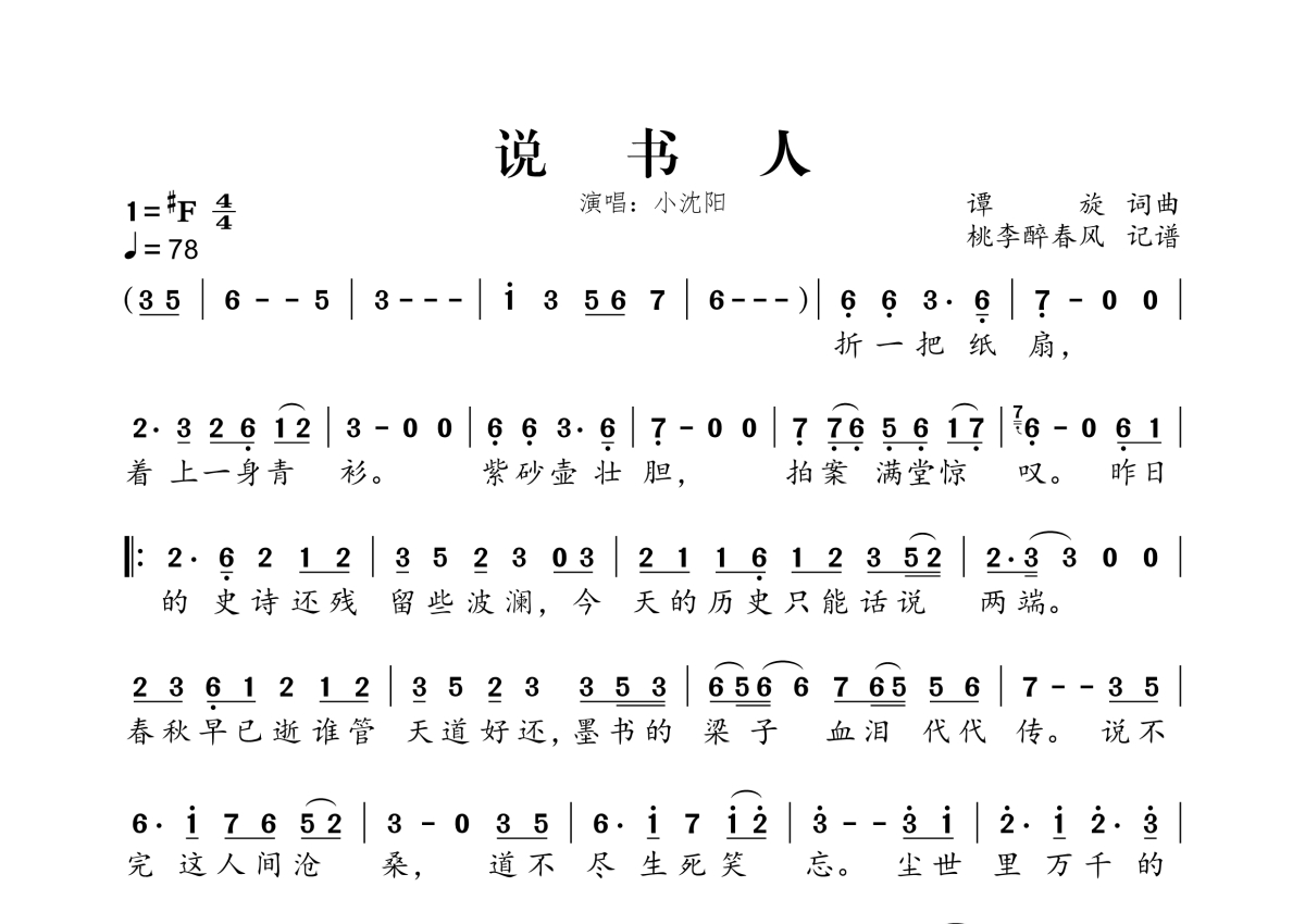 《说书人》是小沈阳演唱的一首歌曲,拍号为4/4拍,歌曲速度为每分钟78拍,这份简谱共有一张高清图谱,图谱由 @桃李醉春风 编配上传。