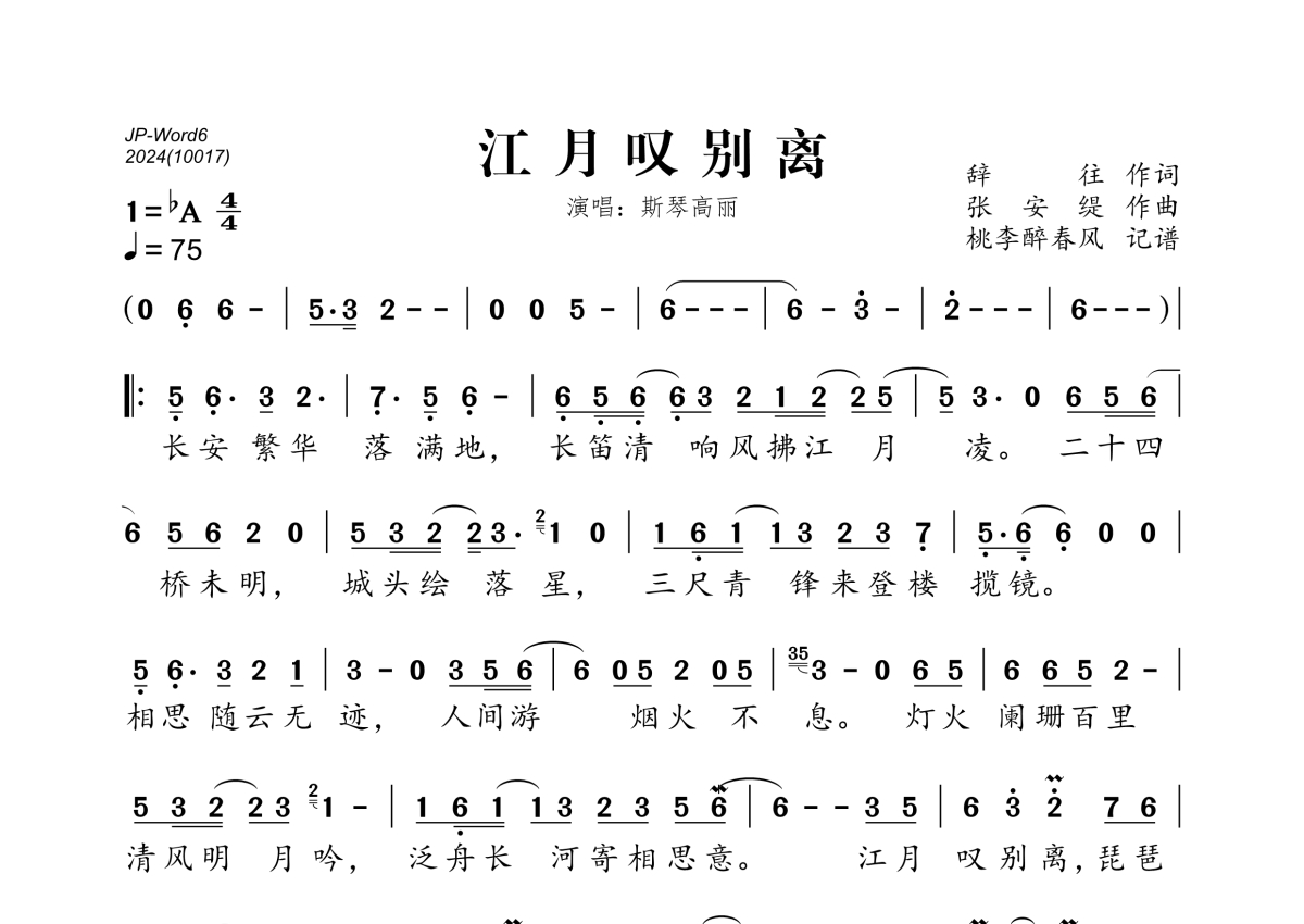 《江月叹别离》是斯琴高丽演唱的一首歌曲,拍号为4/4拍,歌曲速度为每分钟75拍,这份简谱共有一张高清图谱,图谱由 @桃李醉春风 编配上传。