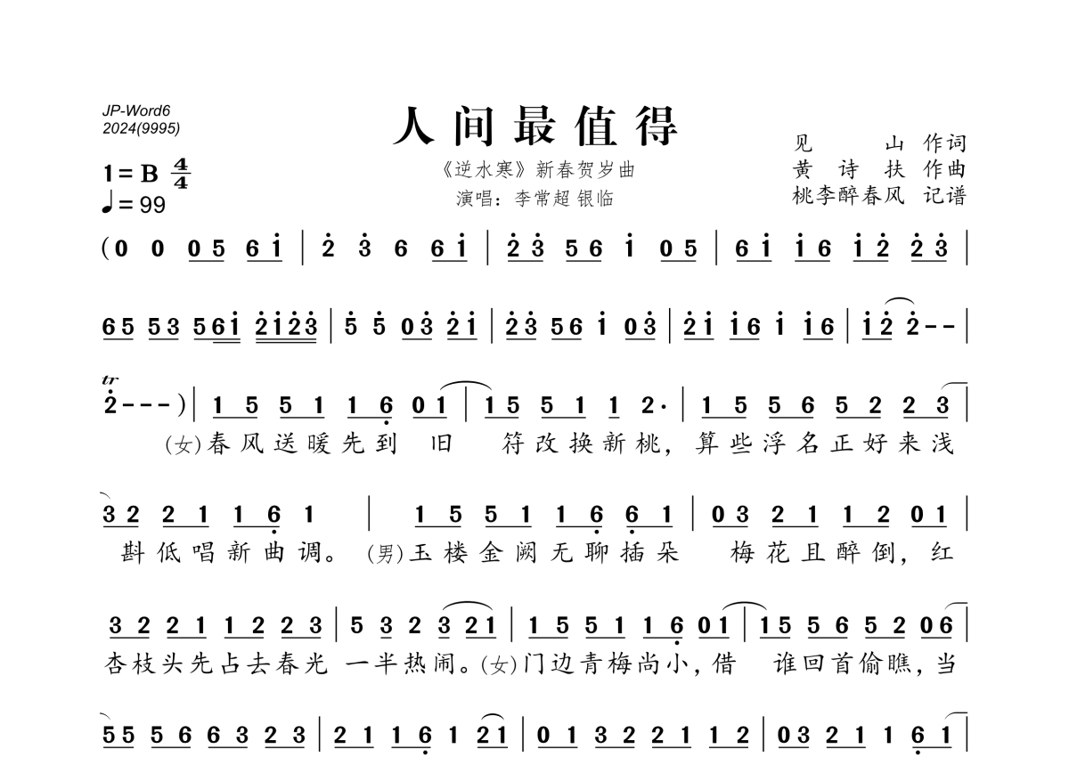 《人间最值得》是李常超/银临演唱的一首歌曲,拍号为4/4拍,歌曲速度为每分钟99拍,这份简谱共有两张高清图谱,图谱由 @桃李醉春风 编配上传。