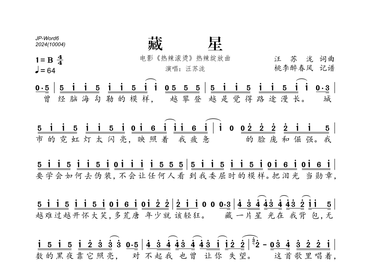 《藏星》是汪苏泷演唱的一首歌曲,拍号为4/4拍,歌曲速度为每分钟64拍,这份简谱共有两张高清图谱,图谱由 @桃李醉春风 编配上传。