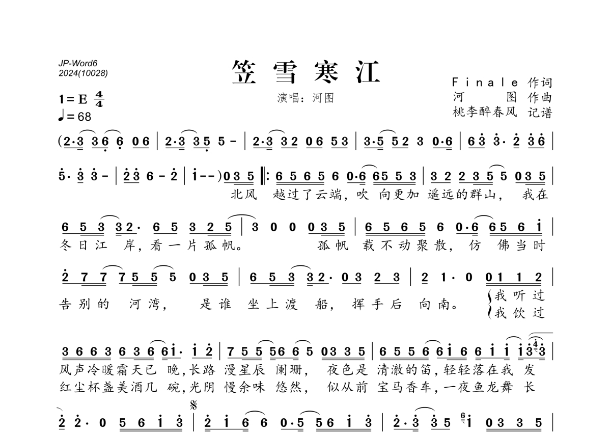 《笠雪寒江》是河图演唱的一首歌曲,拍号为4/4拍,歌曲速度为每分钟68拍,这份简谱共有一张高清图谱,图谱由 @桃李醉春风 编配上传。