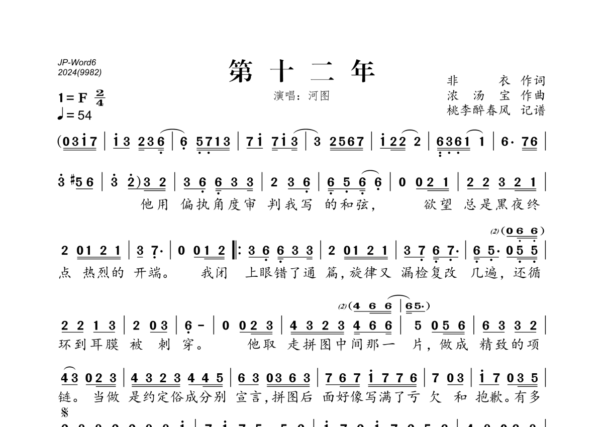 《第十二年》是河图演唱的一首歌曲,拍号为2/4拍,歌曲速度为每分钟54拍,这份简谱共有一张高清图谱,图谱由 @桃李醉春风 编配上传。