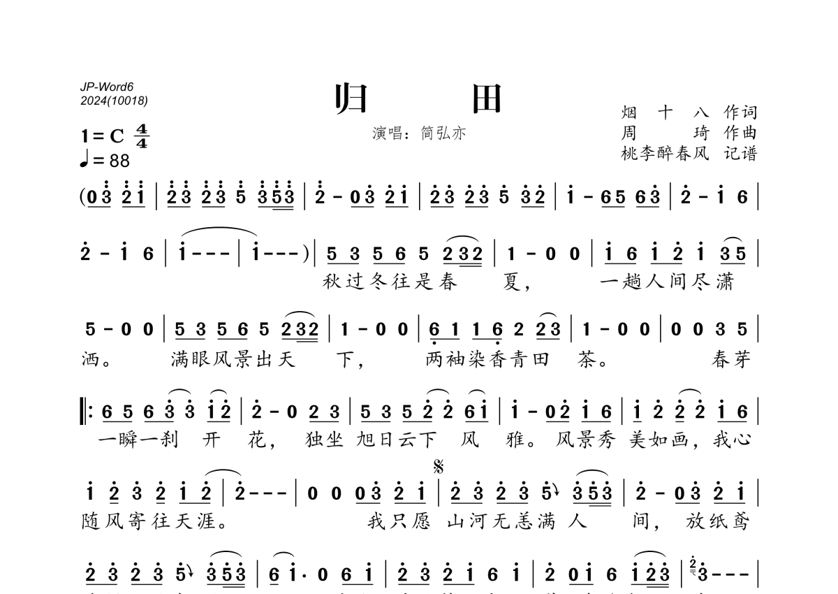 《归田》是简弘亦演唱的一首歌曲,拍号为4/4拍,歌曲速度为每分钟88拍,这份简谱共有一张高清图谱,图谱由 @桃李醉春风 编配上传。