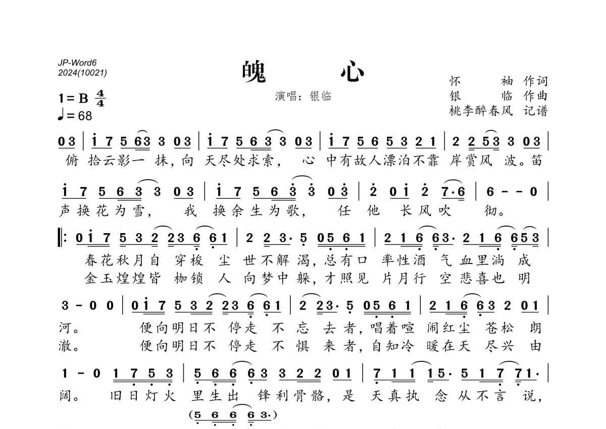 《魄心》是银临演唱的一首歌曲,拍号为4/4拍,歌曲速度为每分钟68拍,这份简谱共有一张高清图谱,图谱由 @桃李醉春风 编配上传。