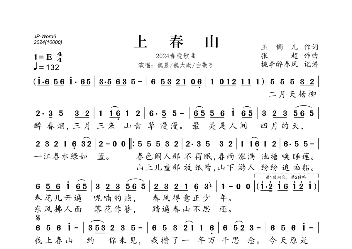 《上春山》是魏晨 魏大勋 白敬亭演唱的一首歌曲,拍号为4/4拍,歌曲速度为每分钟132拍,这份简谱共有一张高清图谱,图谱由 @桃李醉春风 编配上传。