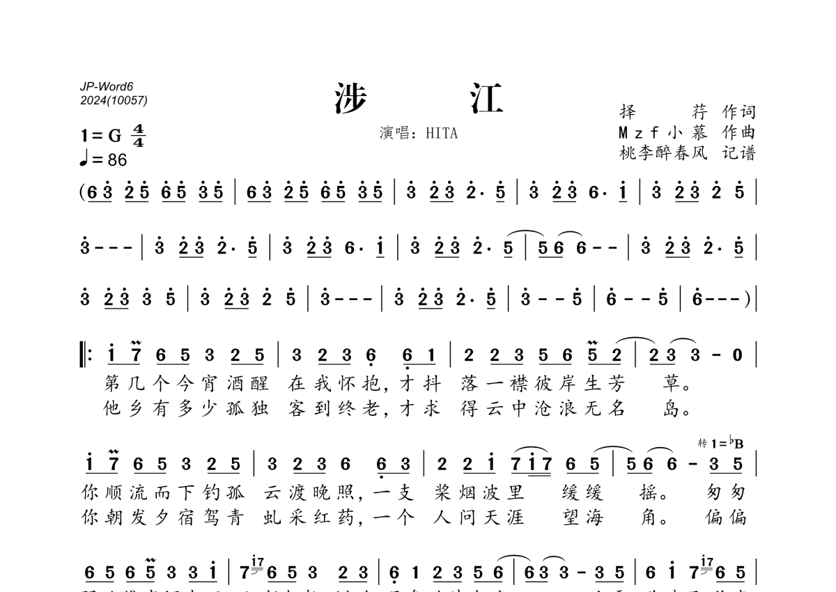 《涉江》是HITA演唱的一首歌曲,拍号为4/4拍,歌曲速度为每分钟86拍,这份简谱共有一张高清图谱,图谱由 @桃李醉春风 编配上传。