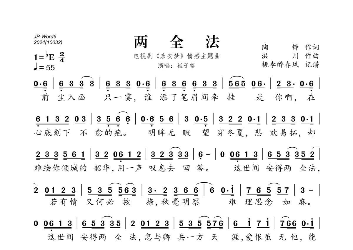 《两全法》是崔子格演唱的一首歌曲,拍号为2/4拍,歌曲速度为每分钟55拍,这份简谱共有一张高清图谱,图谱由 @桃李醉春风 编配上传。