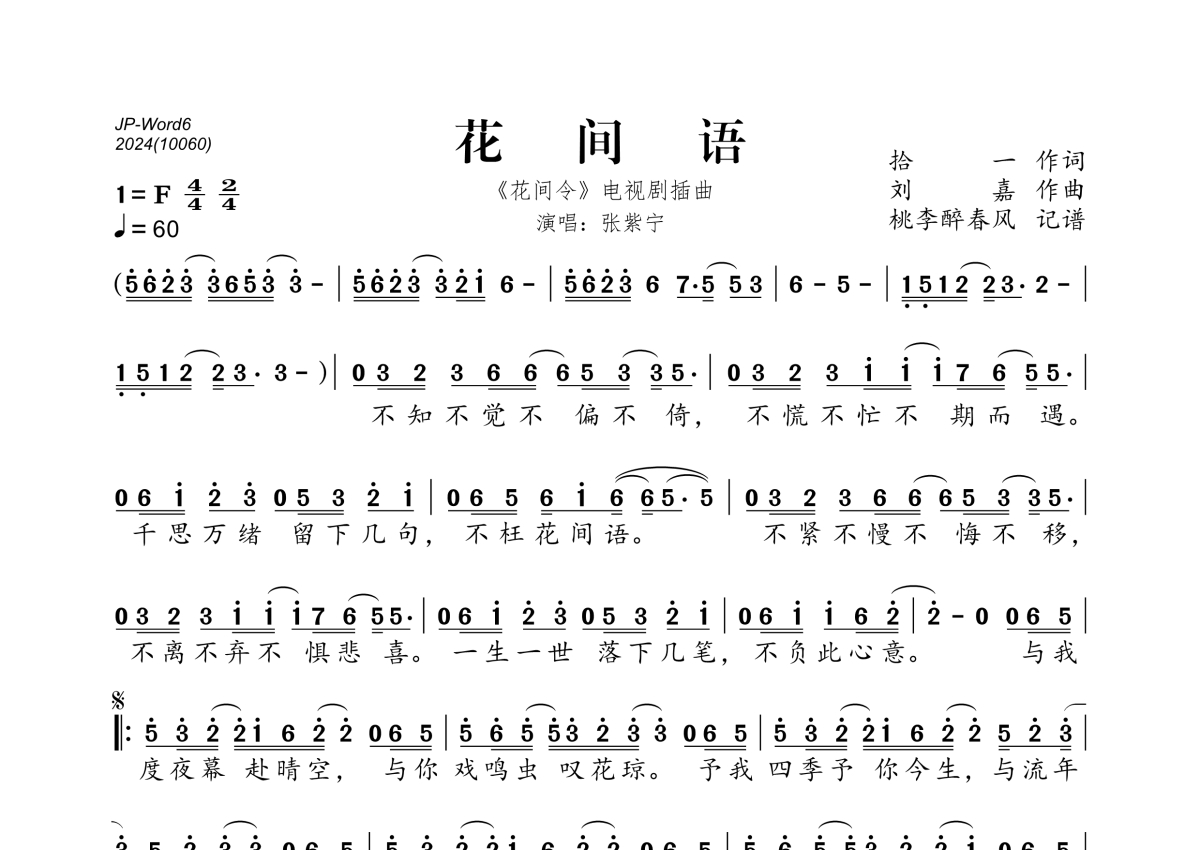 《花间语》是张紫宁演唱的一首歌曲,拍号为4/4拍,歌曲速度为每分钟60拍,这份简谱共有一张高清图谱,图谱由 @桃李醉春风 编配上传。