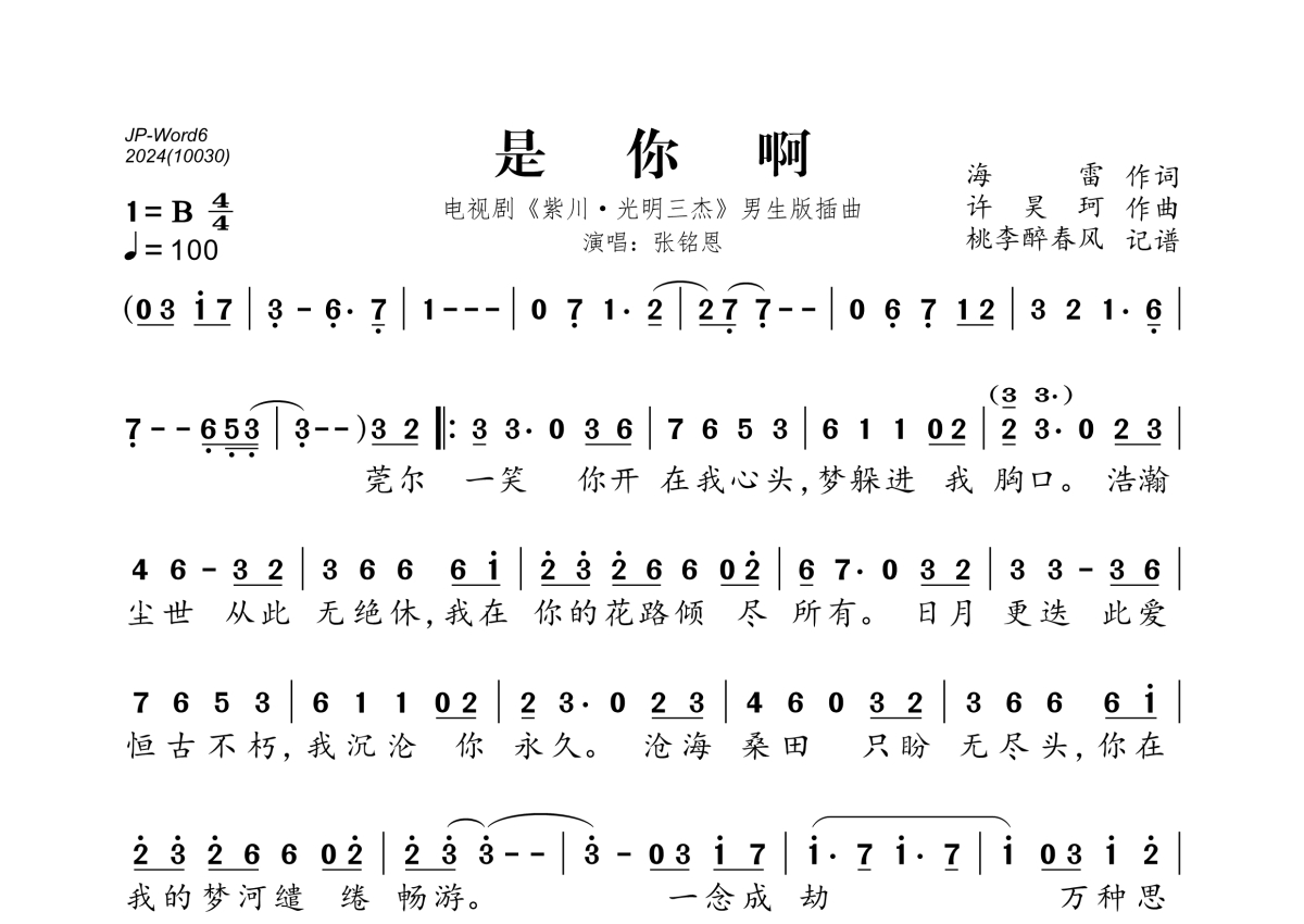 《是你啊》是张铭恩演唱的一首歌曲,拍号为4/4拍,歌曲速度为每分钟100拍,这份简谱共有一张高清图谱,图谱由 @桃李醉春风 编配上传。