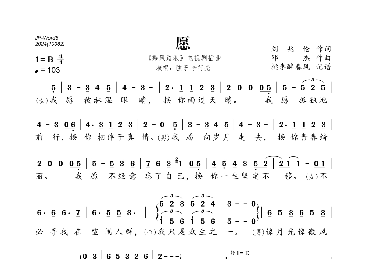 《愿》是弦子 李行亮演唱的一首歌曲,拍号为4/4拍,歌曲速度为每分钟103拍,这份简谱共有两张高清图谱,图谱由 @桃李醉春风 编配上传。
