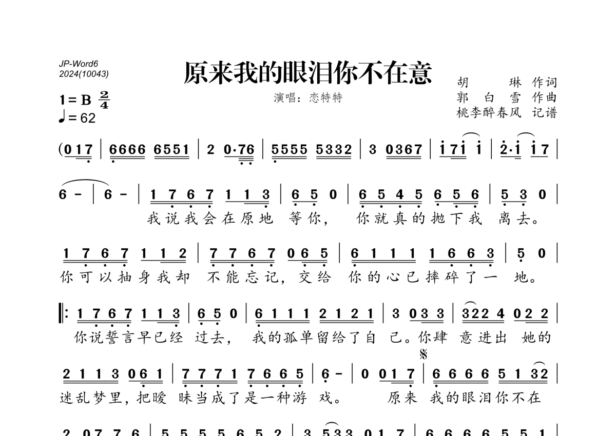 《原来我的眼泪你不在意》是恋特特演唱的一首歌曲,拍号为2/4拍,歌曲速度为每分钟62拍,这份简谱共有一张高清图谱,图谱由 @桃李醉春风 编配上传。