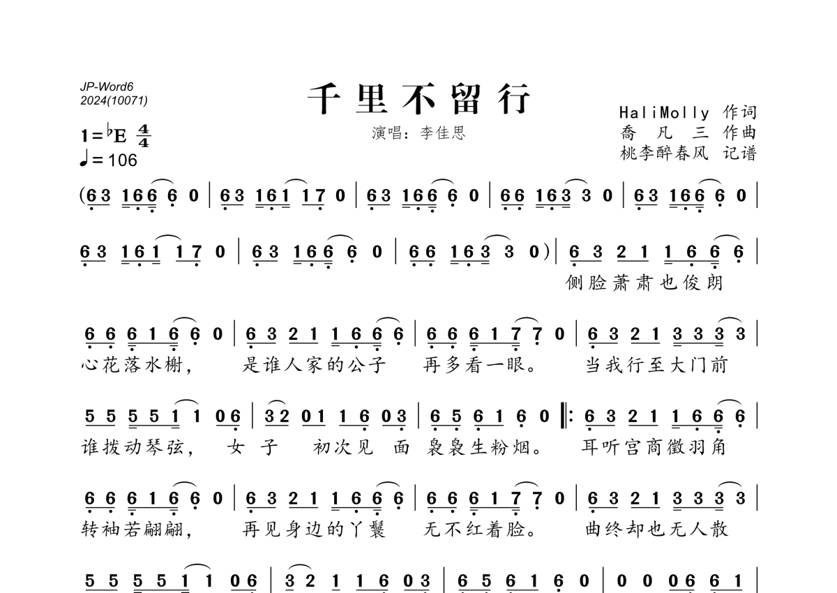 《千里不留行》是李佳思演唱的一首歌曲,拍号为4/4拍,歌曲速度为每分钟106拍,这份简谱共有一张高清图谱,图谱由 @桃李醉春风 编配上传。
