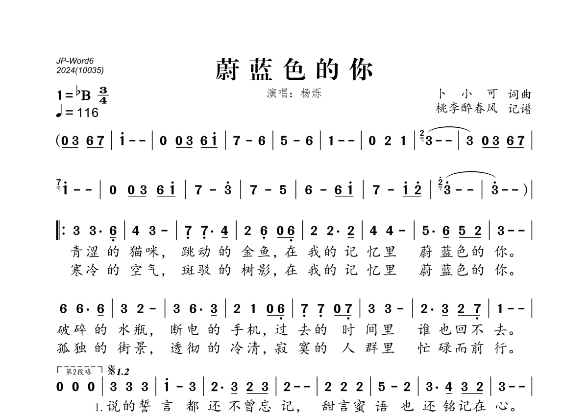 《蔚蓝色的你》是杨烁演唱的一首歌曲,拍号为3/4拍,歌曲速度为每分钟116拍,这份简谱共有一张高清图谱,图谱由 @桃李醉春风 编配上传。